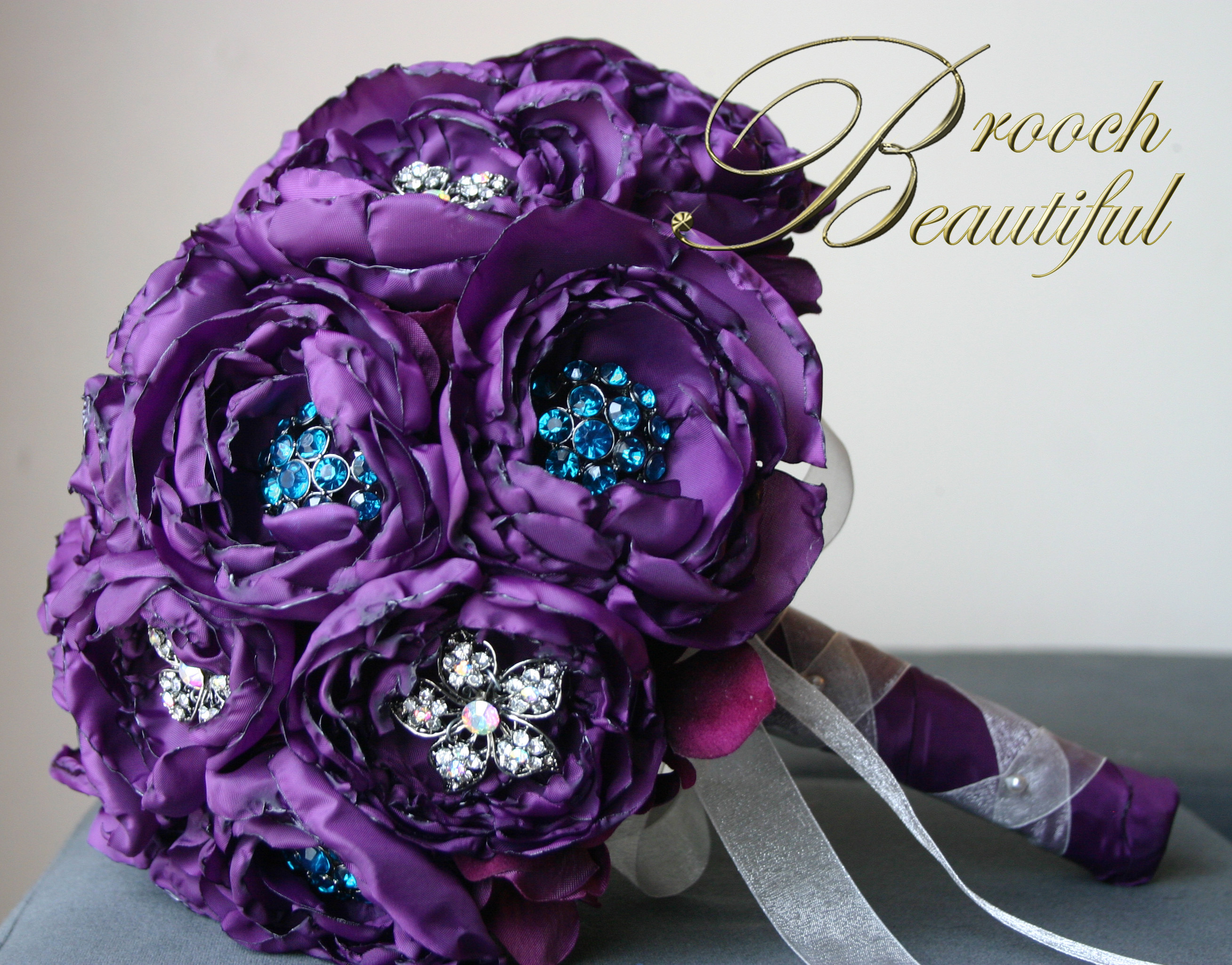 Handmade purple peonies with brooch centers. Created especially for brooches, these peonies look lifelike at first glance. Brooch Beautiful creates handmade peonies year round. There’s no need to wait until spring for your peony bridal arrangement.