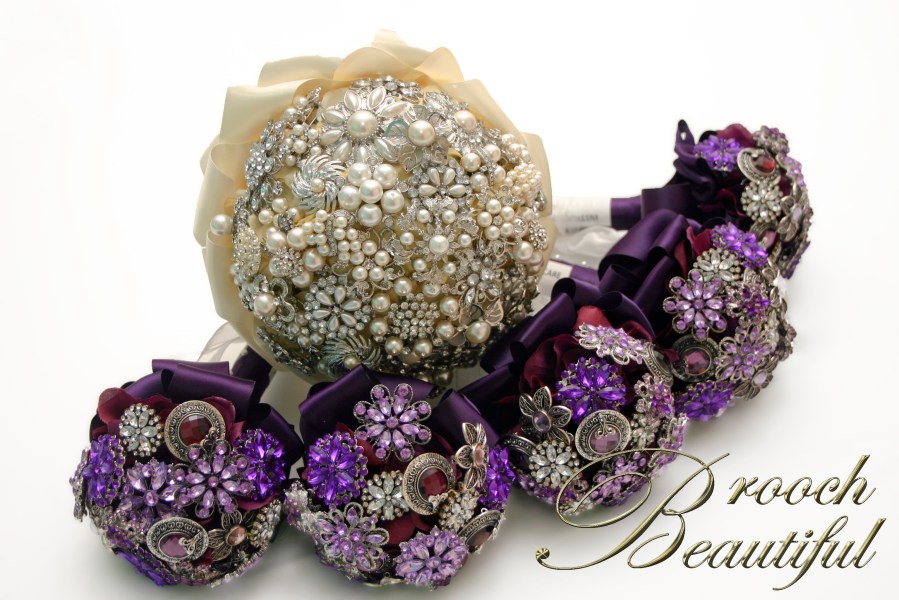 purple ivory bride bridesmaid brooch bouquet